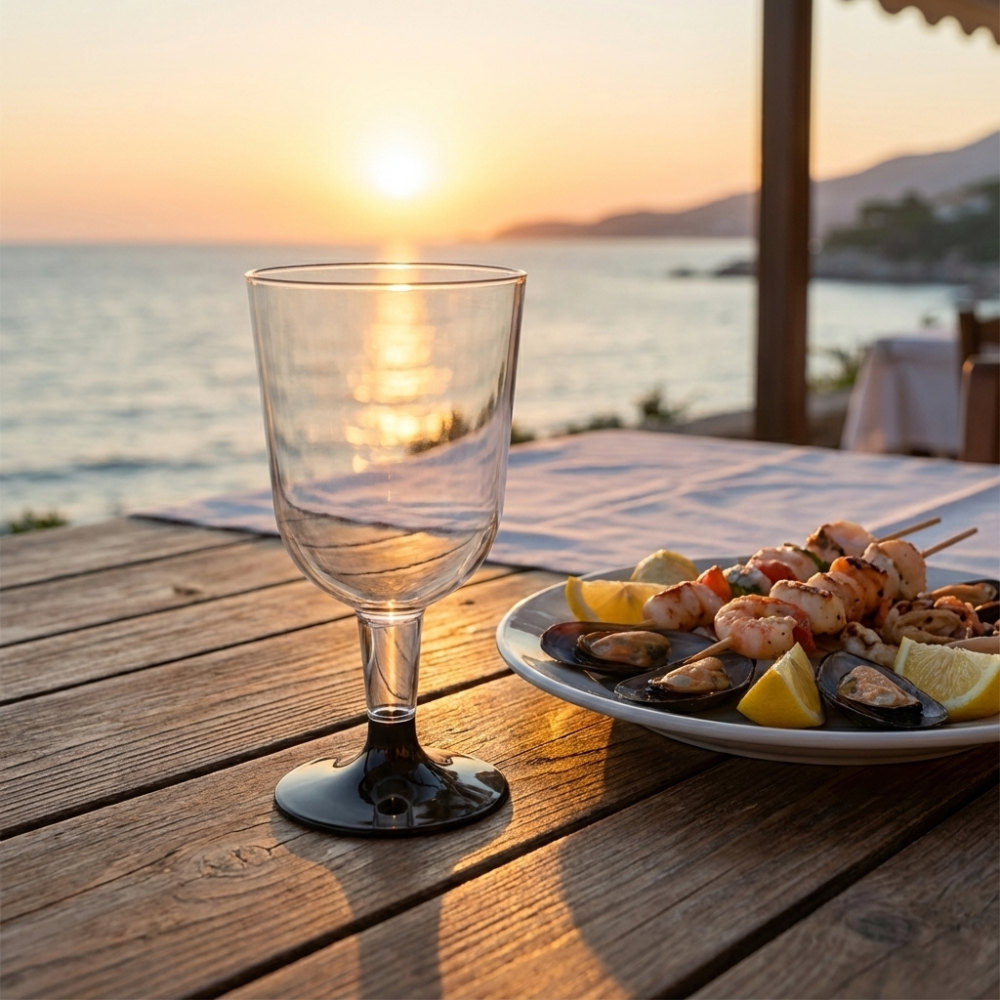 Такой бокал 200 мл в форме чаши с низкой чёрной ножкой имеет привлекательный внешний вид, он кристально прозрачный, похож на стеклянный и хорошо держит форму. Изготовлен из экологически чистого пищевого полистирола. Не выделяет вредных веществ при соприкосновении с пищей. Обладает отличными барьерными свойствами: непроницаем для воздуха и влаги, очень прочный и устойчивый на излом (материал – жёсткий пластик), не разобьётся на мелкие осколки в отличие от стекла. Обладает маленьким весом и компактными размерами, что удобно для его транспортировки и хранения. Бокал служит достойной альтернативой стеклянной посуде на праздниках и фуршетах, в общепите для быстрого питания и еды на вынос, а также для бортового питания в поездах и самолётах.