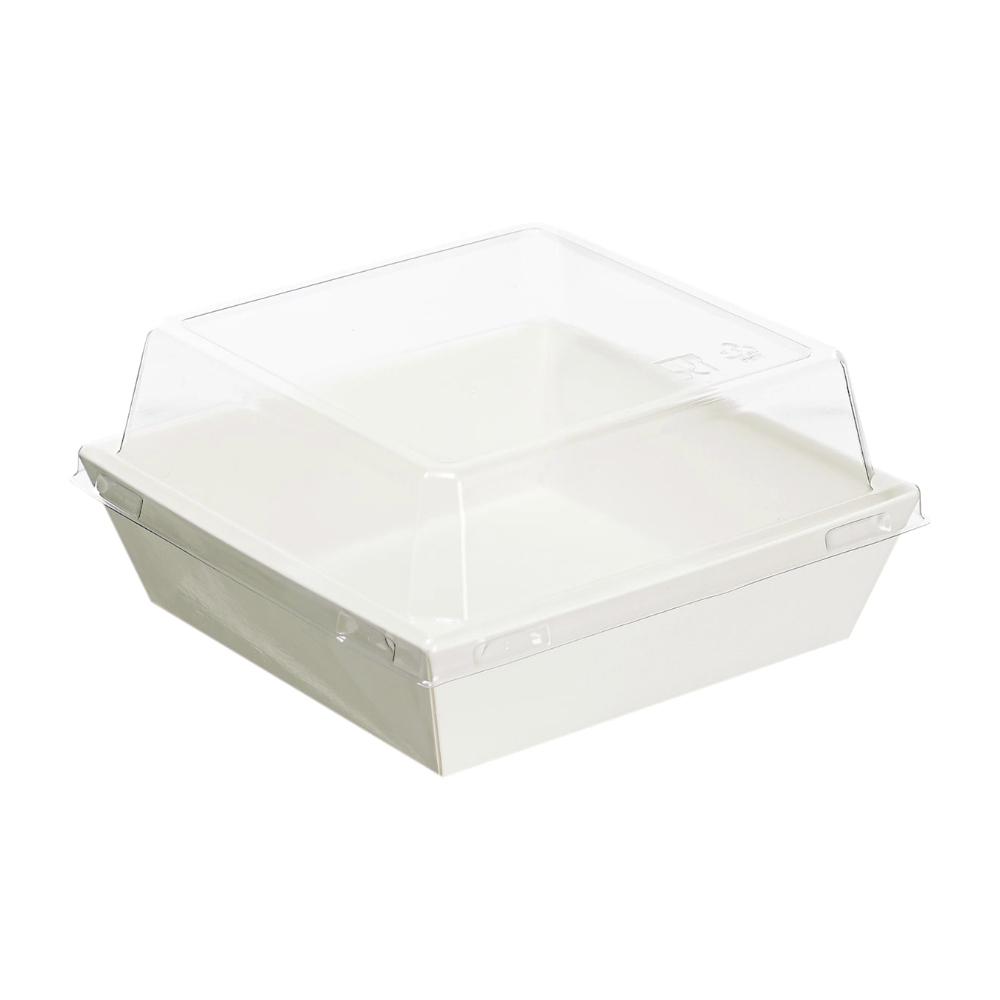Контейнер для еды квадратный 450мл 120/100×120/100×35/65мм белый бумажный ламинированный с прозрачной купольной крышкой по 600 шт/кор