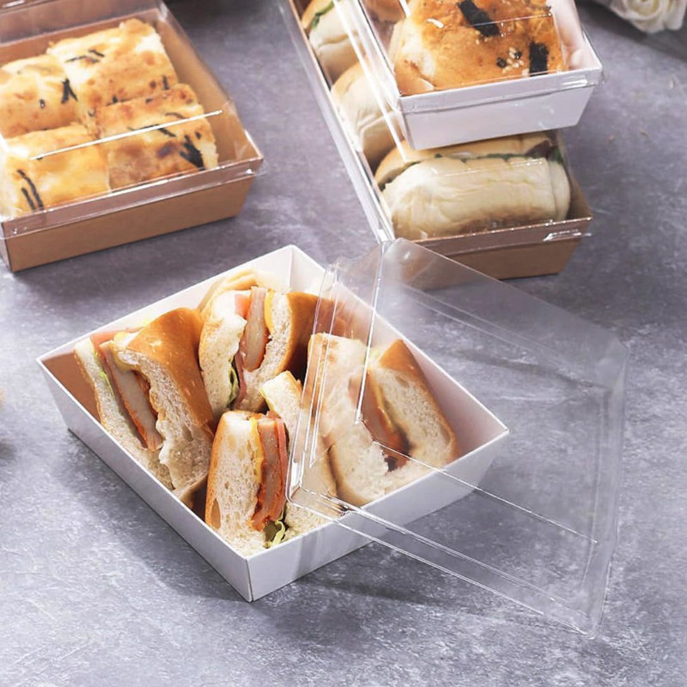 Кондитерская упаковка бокс купольная для десертов 450мл 120/100x120/100x35/65мм бумага/картон белая квадратная внутреннее БОПП покрытие со съёмной прозрачной купольной крышкой одноразовая (600)