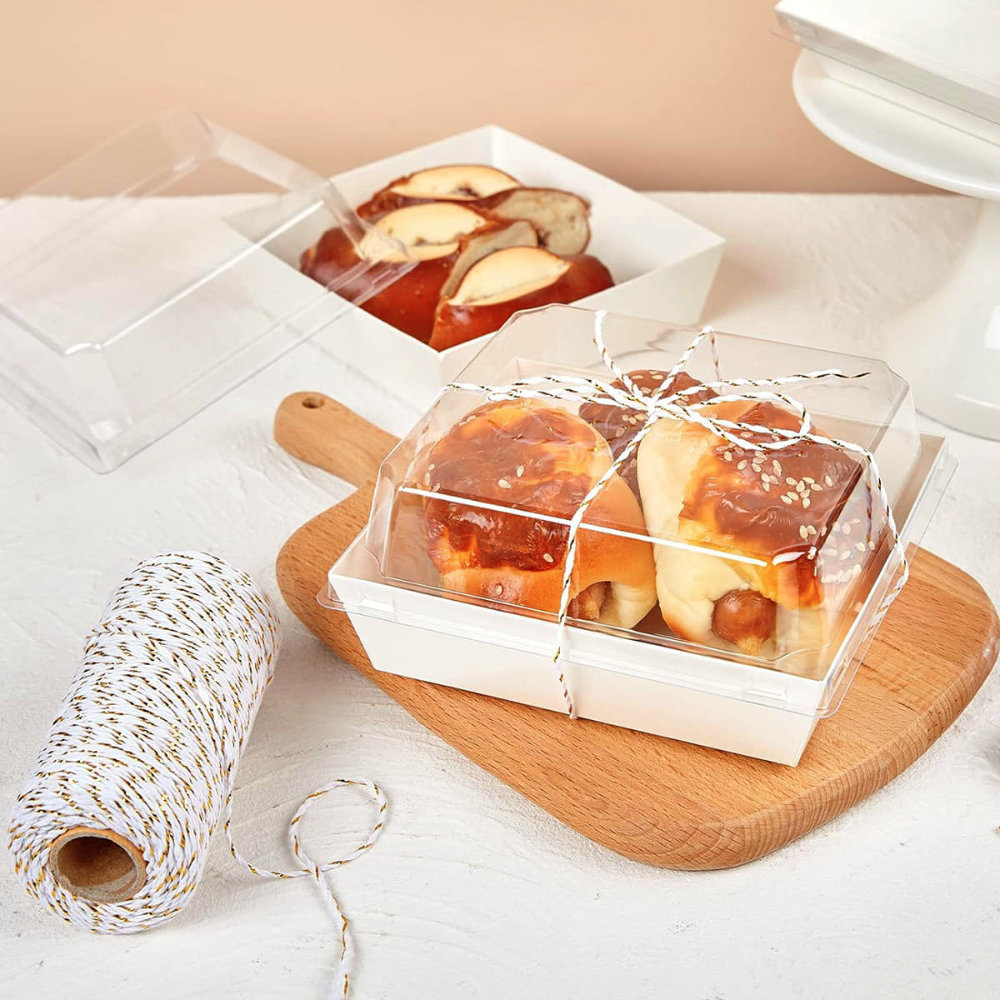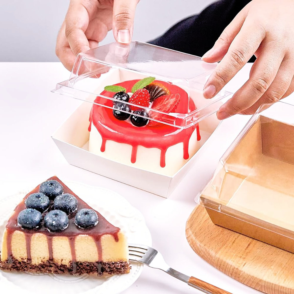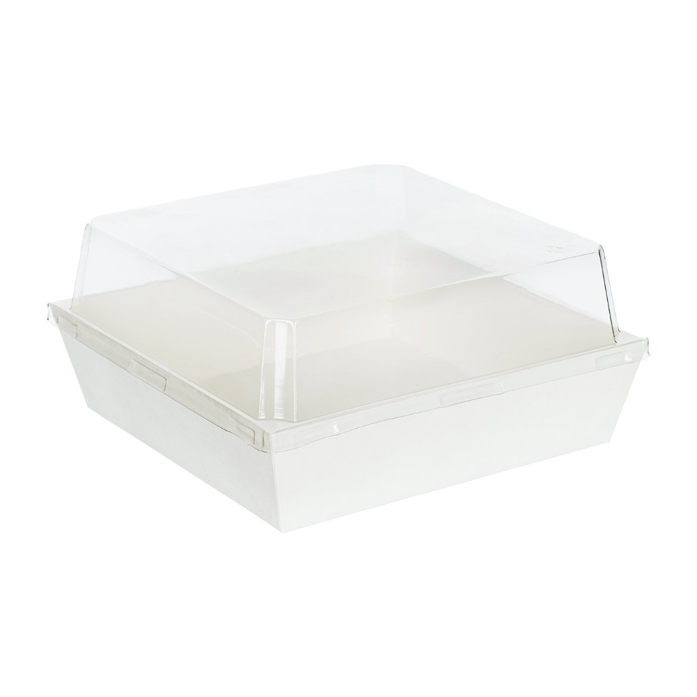 Кондитерская упаковка бокс купольная для десертов 750мл 150x150x80мм бумага/картон белая квадратная внутреннее БОПП покрытие со съёмной прозрачной купольной крышкой одноразовая (300)