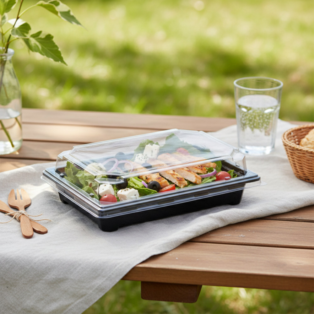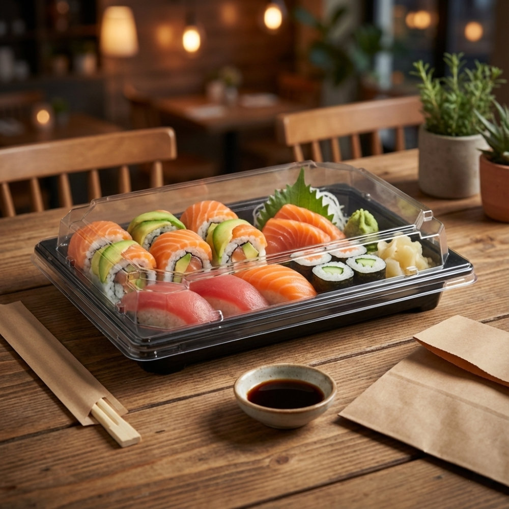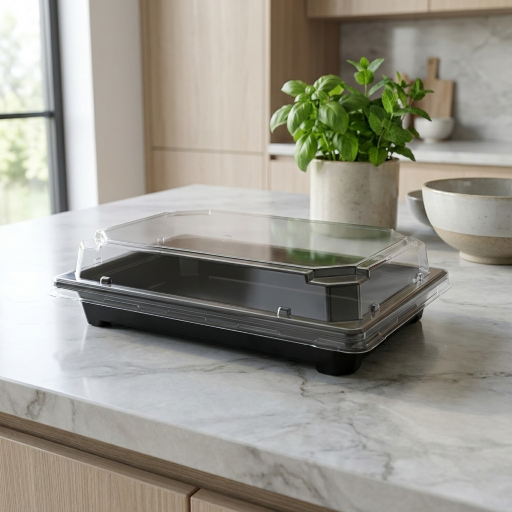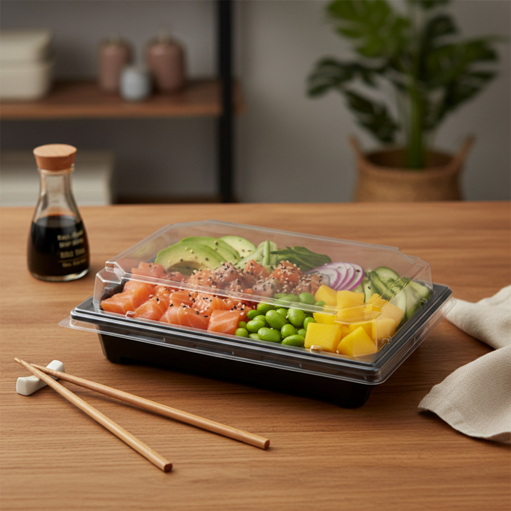 Чёрный прямоугольный пластиковый лоток со съёмной прозрачной купольной крышкой 183х134х45 мм – наиболее распространенный вид упаковки для суши и роллов. Такой контейнер хорошо подходит для перевозки и доставки суши и другой еды. Избавляет от необходимости использования посуды. Идеально подходит для презентации пищевых продуктов, а также для еды на вынос. Удобен в использовании предприятиями общественного питания и конечным потребителем. Максимально простая конструкция не требует никакой сборки. Используя пластиковый контейнер с крышкой, можно гарантировать гигиеничность и отсутствие негативного, отрицательного воздействия на качественные и полезные свойства продуктов питания.