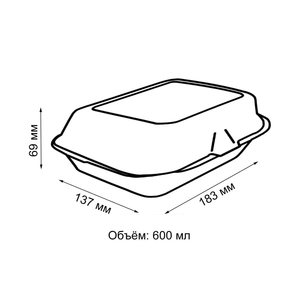Ланч-бокс прямоугольный 600мл 183×137×69мм белый из сахарного тростника с крышкой по 50 шт/уп (500 шт/кор)