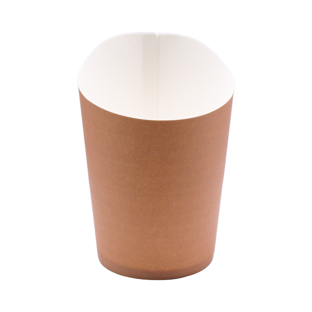 В крафтовые стаканы специальной формы удобно расфасовывать фаст-фуд, они пригодны для использования с совками для картофеля фри. Вырез позволяет удобно доставать продукт из стаканчика. В такой упаковке удобно подавать различные закуски, наггетсы, фрукты и орехи, печенье, картофель фри и картошку по-деревенски. Идеально подходит для фаст-фуда, стрит-фуда, служб доставки еды и других предприятий общественного питания.